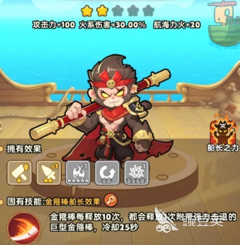 第一个为大家推荐的转账就是天命魔猴,天命魔猴在目前的游戏当中也被大家称作为猴子,他自身的能力效果当中是偏向于火系的能力,比如在攻击效果上面可以带来基础100点的输出,之后他在后期伤害上面还可以增加30%的输出,后期如果用来作为船长的话,还可以为大家在航海玩法当中的火力增加20点,所以放在这里用的话,天命魔猴也是非常强势的一个船长,另外在他自身的技能效果当中,大家可以看到他有金箍棒加成的时候,其实每一次释放就可以获得一个加强版的技能效果,每一次达到10次释放之后,都天命魔猴可以带来一次附加了击退能力的巨型攻击,那么这里10次以后,大家并不是可以快速练习释放,而是需要冷却25秒之后才可以再一次使用这个能力,所以对应了相应的神器之后,打出来的组合效果会更好用,特别是在他升级到二星以后,还可以激活一个羁绊,叫做重锤,升级到五星的情况下,也可以带来火系的羁绊能力,这样的话产生的buff加成效果当中还有额外20%的加成,在开场时期让火系羁绊增加一个的话,他在火队里面也会更好用。