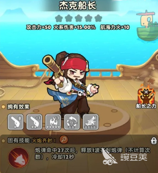 最后为大家介绍的这个船长叫做杰克,杰克船长目前也是火系里面比较出色的一员,他自身攻击力加点上面是50点,然后火系伤害带来的百分比也有15%,当然在航海火力上面就只有10点的加成,另外他自身的技能效果当中可以强化的是火炮类型的能力,每一次命中了敌人达到27次之后,他就可以带来一波骑射炮弹,这里的炮弹效果在获得的加强能力当中,升级以后的火力是非常强大的,而且如果用杰克此类技能效果来进行前期过渡的话,是非常适合走一个速攻流的,另外他在火枪羁绊效果上面如果能够提到二星级的话,这里能够带来的提升数值也会更多一些,升级到五星的情况下,还可以根据每一段的水系能力产生相应的增益buff,在冷却时间达到12秒以后,他也可以快速释放自身其他的技能,所以放在某些火队里面,杰克也是可以在商店里面进行兑换获取的,如果在猴子跟杰克这两个火系角色当中进行选择的话,前期就更建议大家去玩儿猴子,后期如果是想要特殊阵容组合的话,大家还是可以玩儿杰克的。