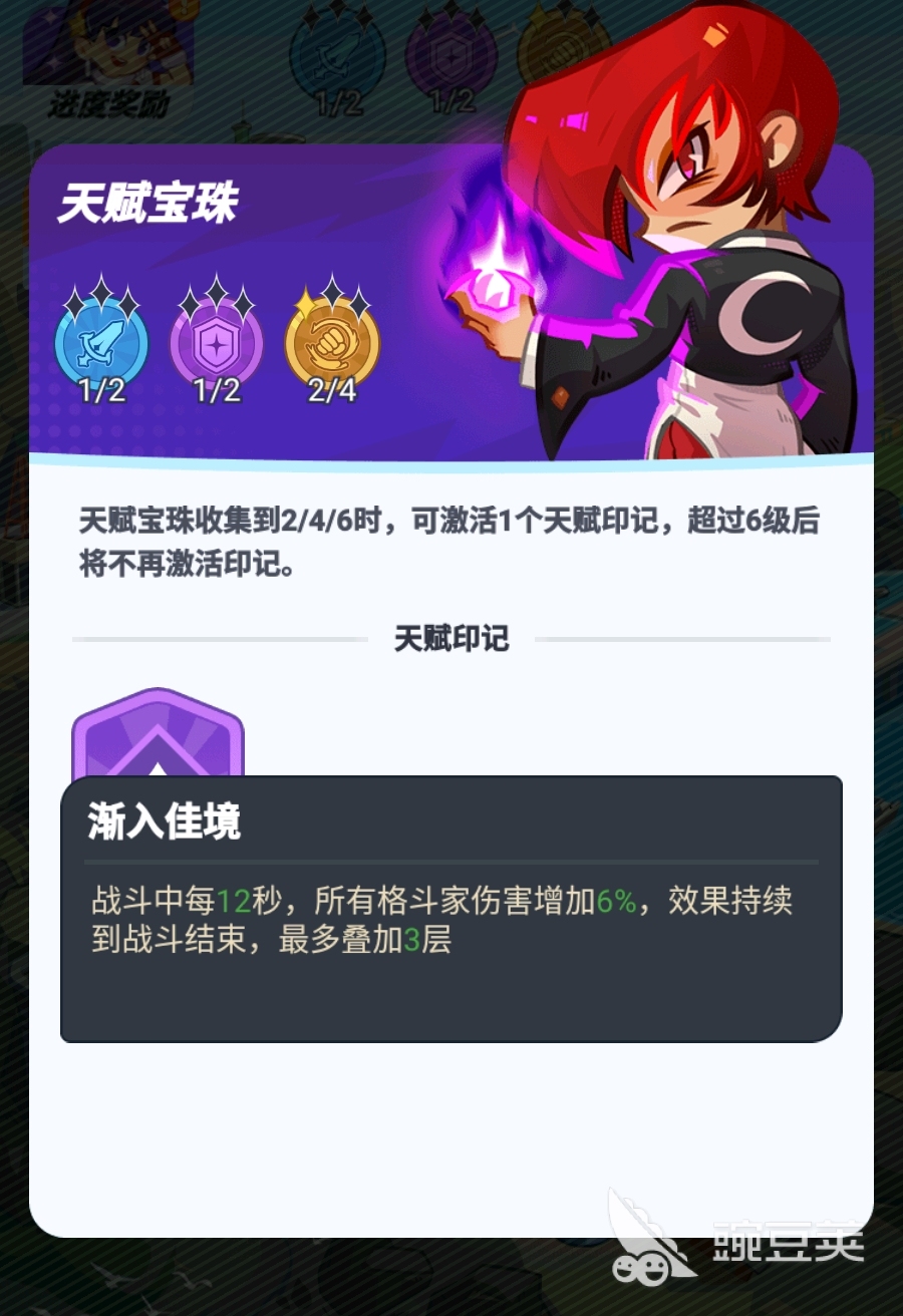 每完成一小关的挑战,玩家们还能从随机抽出来的三种天赋宝珠中选择其一,来完成对阵容的强化。颜色不一样的天赋宝珠所提供的加成方向也有所差别,玩家可按照自身阵容的特性,合理地去挑战适配的天赋宝珠来进行强化。同一颜色的天赋宝珠在拿到多个时,还能解锁能提供特殊加成的天赋印记,能为玩家进一步提升阵容的强度,且提升的幅度比较大,因此很建议多拿同颜色的天赋宝珠,尽可能地令自己的阵容能获得更多天赋印记。