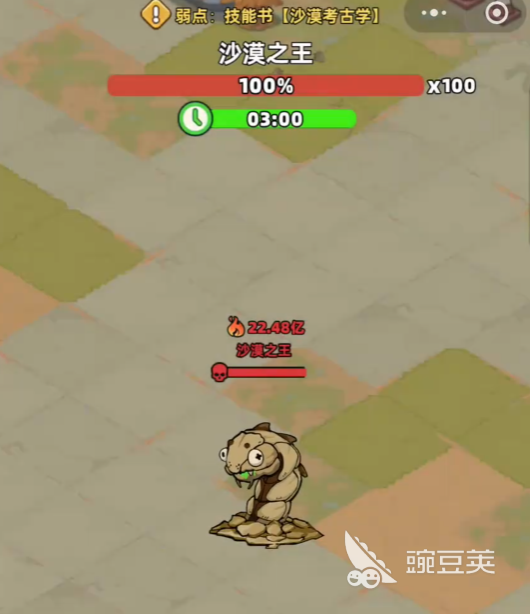 从首领的信息可知,游戏化的界面下,沙漠之王表面上是温和的,实际上非常危险。系统明确标出它的弱点是技能书【沙漠考古学】,这就意味着玩家在组建队伍的时候,应该先选择具有该技能或者类似属性克制效果的队员上阵。利用弱点攻击会提高百分比伤害,也可以破坏BOSS部分蓄力动作,从而减少战斗风险。除了上述情况外,从上图可知蝎子王、鬼夫人在上面,沙漠之王在下面,因此沙漠之王的血量是其他三个人血量总和的两倍多,也就是说沙漠之王战斗节奏更偏向消耗型,给玩家续航能力和资源储备带来了很大的压力。