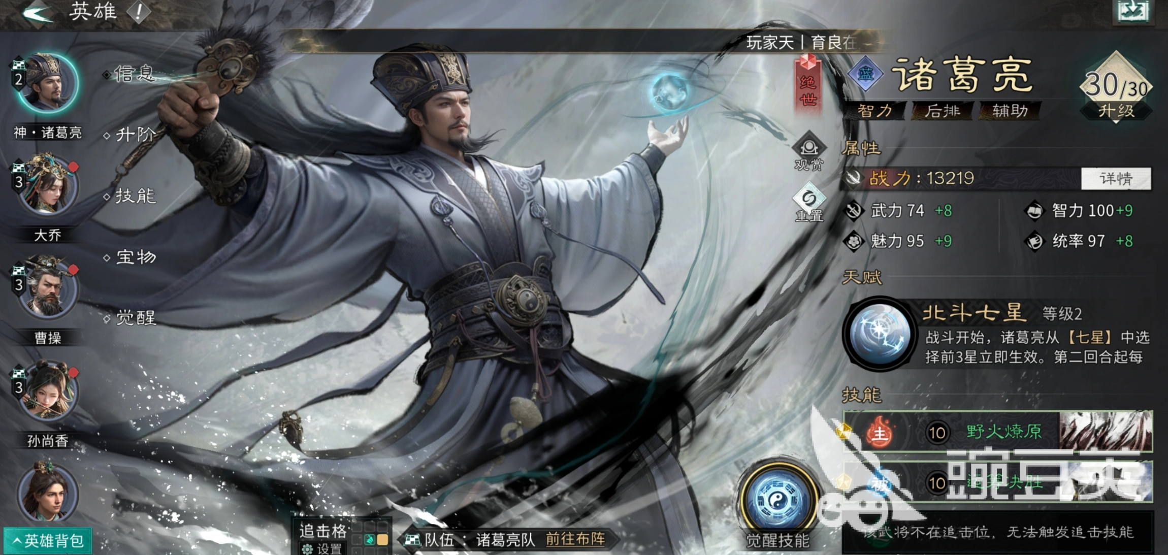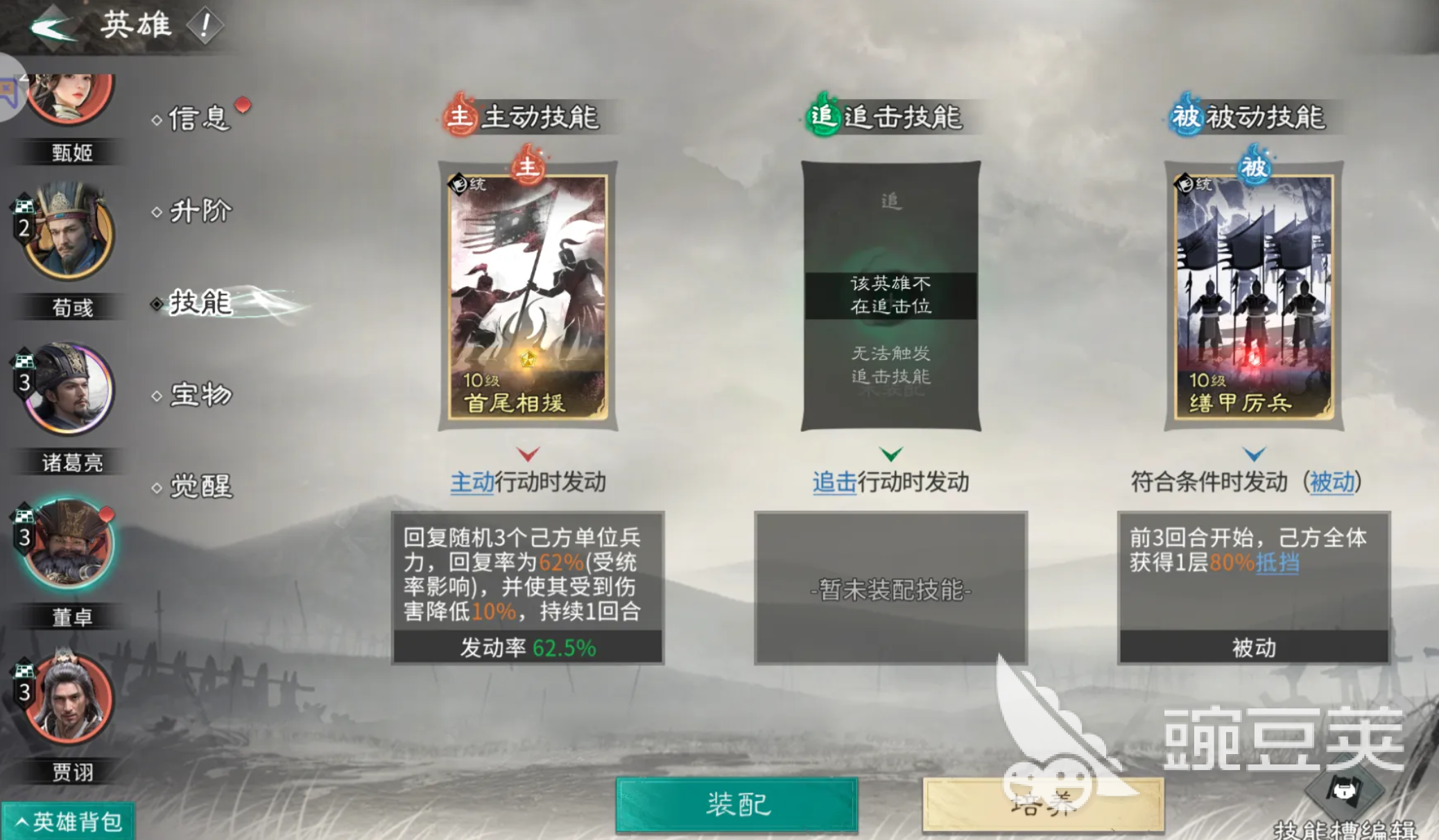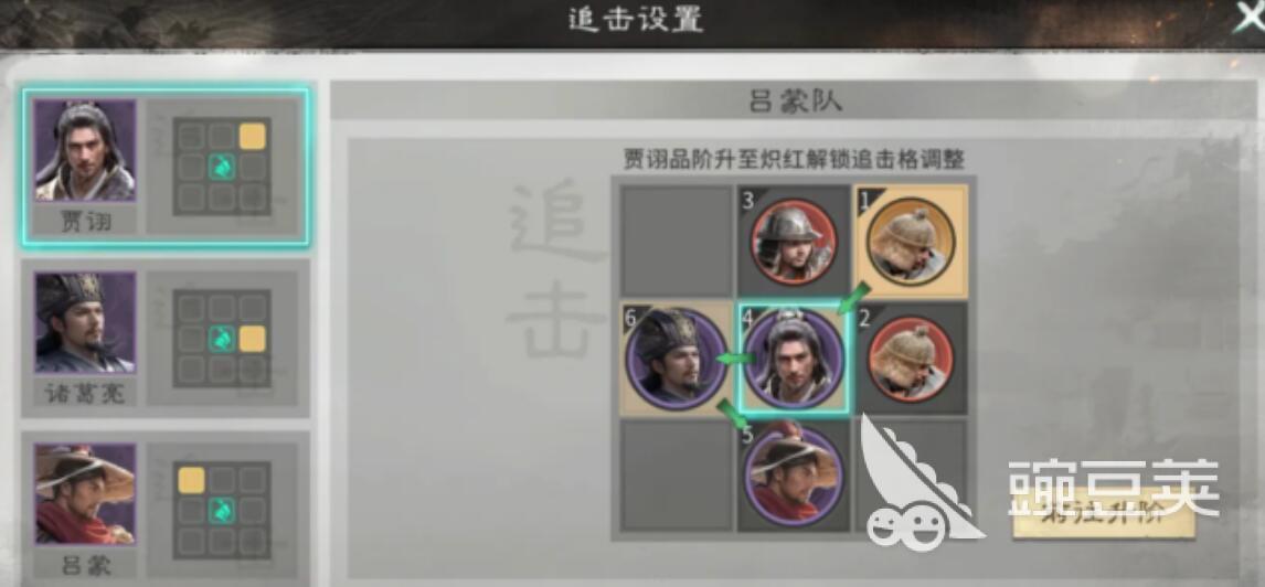 诸葛亮作为控场,通权达变作为必带的技能,这个技能不仅能够打群体伤害,而且还能够稳定附加。控制的效果。在战斗的过程当中,它能够有效地触发贾诩的追击机制,所以说,他跟贾诩吕蒙搭配在一起的时候,可以形成闭环,通常只需要控制链不断,贾诩就能够持续性的输出。而对面的队伍则被完全的压制,想要还手的话是特别困难的。