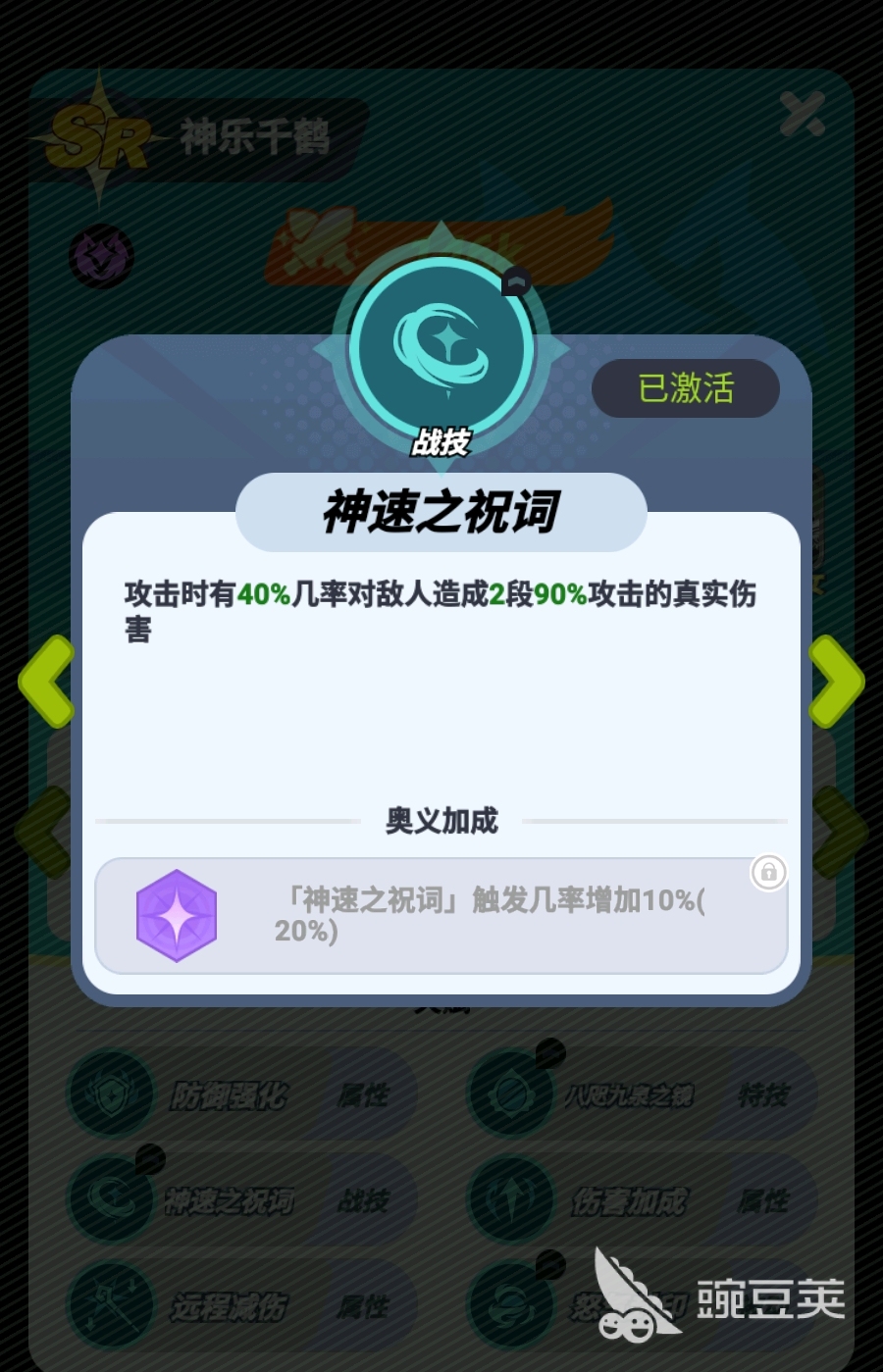 当然,神乐千鹤的强势之处可不光光只有必杀这一点,身为初始SR品质格斗家的神乐千鹤可在获得后直接解锁战技,令自己在进行任何攻击时,都有40%概率会对敌人造成额外的真实伤害,若是能激活战技的奥义效果,那么真伤的触发概率还会额外增加10%,配合上她必杀的多段攻击,可令这一效果在实战中频繁被触发。而在到达SSR品质后,神乐千鹤的特技还能令目标敌人在3秒内无法获得怒气,解锁特技奥义后更可沉默对方。