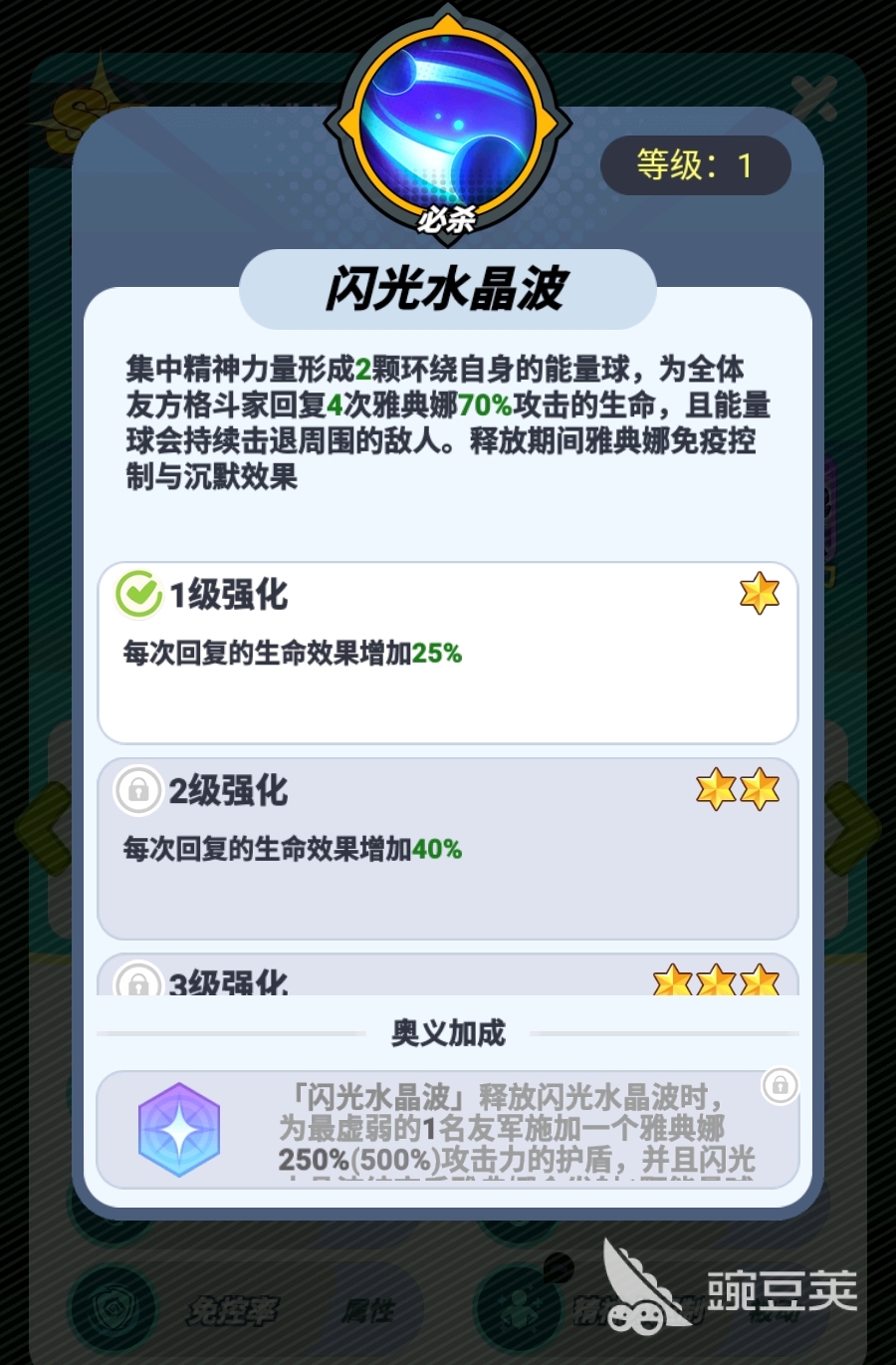 必杀是麻宫雅典娜最为重要的技能,释放时麻宫雅典娜会生成能力球为队友回复生命,且本次回复面对的是全体队友,不管队友与麻宫雅典娜距离多远,都能吃到本次必杀的治疗效果,这也令麻宫雅典娜有着极强的保人能力。若是必杀释放时麻宫雅典娜身边有敌人,那本次必杀还会持续对敌方造成击退效果,而且必杀存续期间,麻宫雅典娜还能免疫任何控制,所以除非敌人能将麻宫雅典娜击杀,否则没办法打断她的必杀。