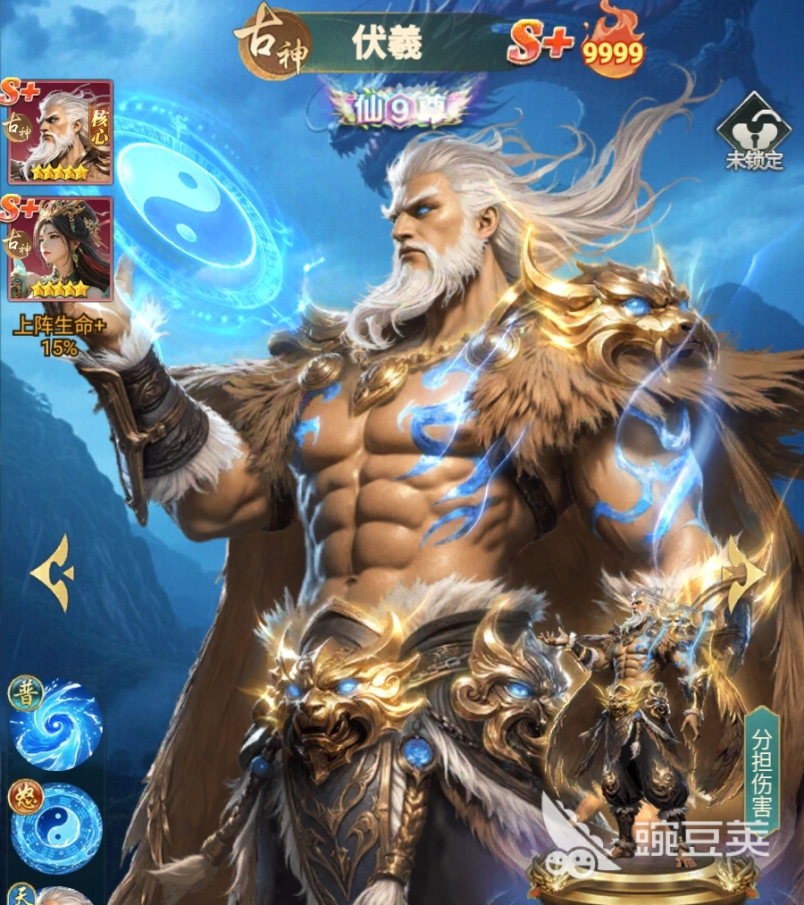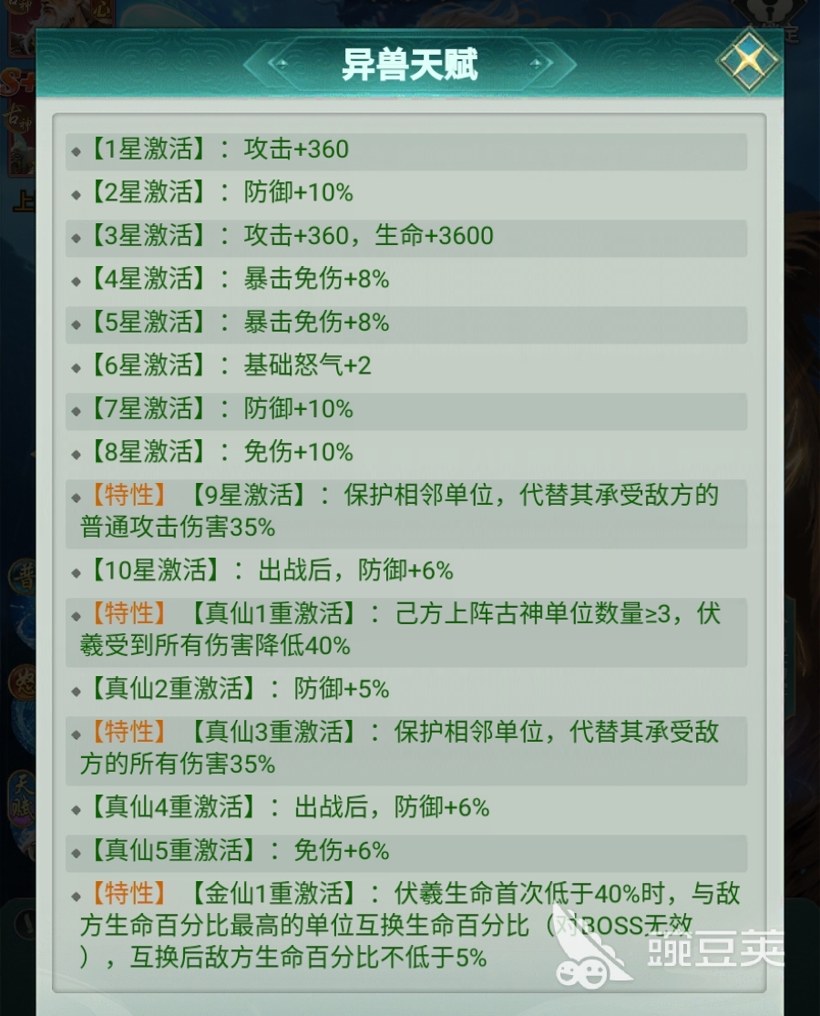 而且,一旦伏羲突破到了9星,伏羲还能在战斗中保护与自己相邻的队友,帮助他们承担一部分所受到的普攻伤害,避免队友的血量被打到比较低的危险线内,减轻队中治疗角色的回血压力。若是伏羲升到了真仙3重,那么这一分摊伤害的效果将对所有伤害都生效,不管敌人是用怒气技还是普攻对伏羲的相邻队友造成伤害,伏羲都可为队友进行伤害分担。此外,真仙1重时,伏羲还能根据己方队伍中古神角色的数量,令自己获得额外的减伤效果,这也意味着伏羲更适合与古神阵营中的角色一起组队。