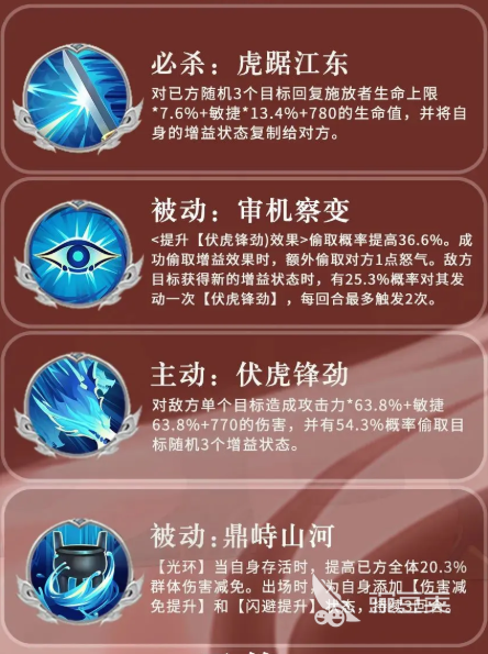 而且对于他身上有负面效果的情况下,天子之气也会直接清除掉,而另外还有一个被动个能力,大家也要注意会用在各种连招当中,因为一次性可以造成三段式的连招效果,这里针对敌人血量不多的时候进行使用,可以造成足够多的削弱效果,队伍当中另外几个角色使用的话,可以跟他的被动能力进行搭配,叠加起来,他被动能力效果上面可以带来的属性加成是比较高的,比如守护的能力激活了以后,这里刘备就不用担心自身的防御不高,然后在技能满级的时候,他各个属性之间的强势能力就会直接触发,此时在水系效果当中,他能够给对面带来更多的硬伤。