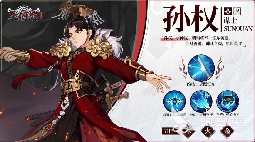 游戏当中大家玩孙权的话,他其实拥有的能力当中是可以带来更多水队的优势,这类属性其实目前都是可以给自身带来一部分治疗,然后给对面带去伤害的时候,也会在80级之后有一个强度分水岭,玩孙权的话,建议是把他培养到80级以后,他就会有一个金属性可以解锁出来,此时他带来的伤害能力当中还伴随着减益效果可以用,那么,在玩儿孙权的过程当中,大家如果要配对的话,目前经典的效果当中,就是搭配刘备、曹操,这三个主将放一块儿的话,他们带来的三足鼎立羁绊能力就是游戏当中非常强势的一个加成效果,其中专属的羁绊为三名的成员带来速度上面的提升,而且基础都是每个武将相同的,都会有48点的提升,这里在激活了羁绊之后,还会有一些道具奖励,通过这些奖励,大家还可以提升孙权各个技能之间的协同能力,所以选择他来进行阵容配队的话,走谋士阵容是非常适合的。