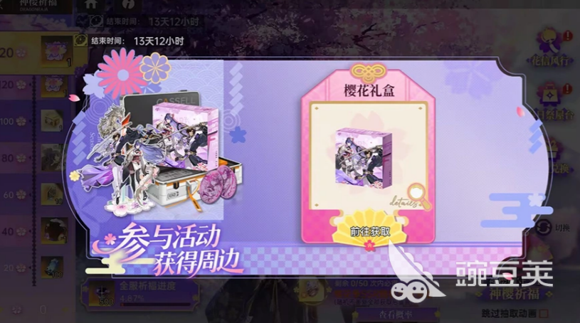 「神樱祈福」是这次活动的核心玩法,用前面攒下来的「神樱御守」来祈福,祈福次数到了就能解锁奖励。奖励里面有限定头像框「游樱百景」,还有皮肤「天照命源稚生·樱龙显世」,这个皮肤的名字听起来就很有气势。除了皮肤,还有全新作战装备套装「樱吹雪」,每次祈福都有机会拿到这套装备,不是只有攒够次数才给,所以祈福的过程本身也有收获。奖励里还有一个实物周边「樱花礼盒」,这个比较特别,是真实的周边产品,喜欢收藏的玩家可以留意一下。