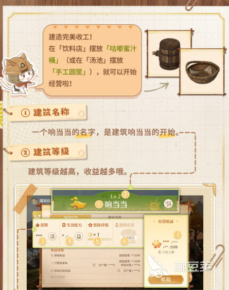 家具摆好了,建筑就可以正式开始运营了。饮料店需要摆上「咕嘟蜜汁桶」,汤池则是放「手工圆筐」,这两样算是开业的关键道具。运营期间,经营收益会慢慢积累,饮料店对应的产出是「甜甜蜜果」,汤池则是「融融温泉石」。收益不只看建筑等级,还跟摆放的配方、装饰评级都有关系,所以布置得越用心,回报也越高。另外记得时不时去「营收纪事板」看一眼,那里会显示最近的营业情况和获赞记录,偶尔还能看到菇菇客人留下的有趣评论。
