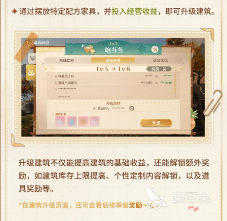升级建筑也是很重要的一环。摆放特定配方家具并投入经营收益,就可以给建筑升级。升级之后基础收益会提高,还能解锁库存上限提升、个性定制内容、以及道具奖励等额外好处。在「个性定制」页面,可以给建筑改名,还能自由调整帐篷颜色、招牌样式和装饰样式,整体风格完全可以按自己的想法来搞。