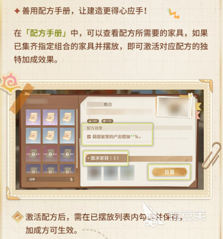 配方这个系统值得单独说一下。在「配方手册」里可以查到每套配方需要哪些家具,如果已经把对应家具都摆进去了,就能激活这套配方的加成效果。激活了之后,还需要在「已摆放列表」里手动勾选保存,加成才真正生效。要注意每个建筑同时能生效的配方数量是有限的,上限会随建筑等级提升而增加。如果有家具还没集齐,点「追踪」可以把缺少的材料加进制作台的追踪列表,方便后续补全。