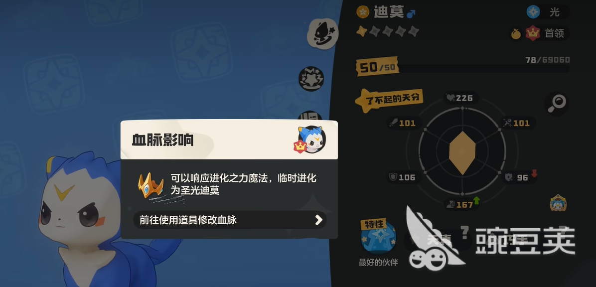 进化之后的迪莫,在能力上有了质的飞跃,最明显的改动就是,它现在可以走魔攻爆发和控场反制两条路。这种双修的设定,让它在面对不同敌人时,非常有弹性。它的种族值直接堆到了700点,魔攻数值更是能冲到150以上,这在前期和中期,都是非常夸张的数据。最厉害的是,那个叫奇光异彩的技能,出招速度特别快,不仅能把身上的负面状态清理掉,还能反弹伤害。打那种很难缠的大怪时,用这招打断对方节奏,能给队友创造出很舒服的输出机会。