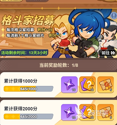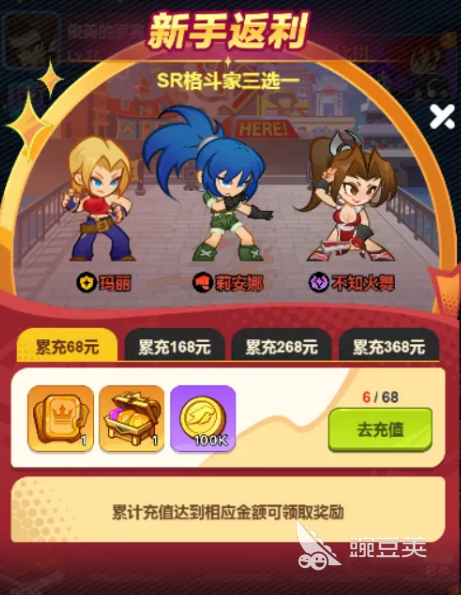 另外有一个新手返利活动要特别注意,前期角色来源很大一部分靠这个。累充达到68、168、268、368元的时候,分别能领1、1、2、2张,一共6张格斗家自选卡。可以从玛丽、丽安娜、不知火舞三个角色里选。小编比较推荐玛丽和不知火舞,玛丽前排抗伤能力很强,不知火舞后排爆发输出很猛,配上首充的八神庵,基本阵容就差不多成型了。