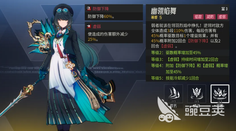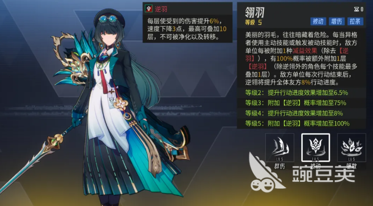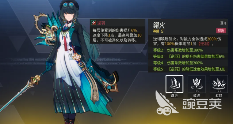 她的这个被动叫做翎羽,用到的情况下,是根据前期其他角色使用的减益来多层附加逆羽,所以逆羽在这里说施加的层次越多的时候,逆翎目前用到的效果也是会越多一些的,特别是在后期敌方在行动结束以后,逆翎还可以加上我方全体的角色,造成一个拉条的效果,此时可以将她的等级进行提升,不然的话,逆翎吃不到这里的速度加成,可能也没有那么强的能力可以用,但是逆翎在有速度加成的情况下,后期能够带来的输出确实是非常强的,这里她的终结大招效果就是对敌方的群体,敌人都造成三段式的伤害,每一段的伤害当中,逆翎都可以给对面的增益效果驱散掉一个,同时附加一些负面效果的时候,一般就是施加的防御下降以及削弱类型的效果。