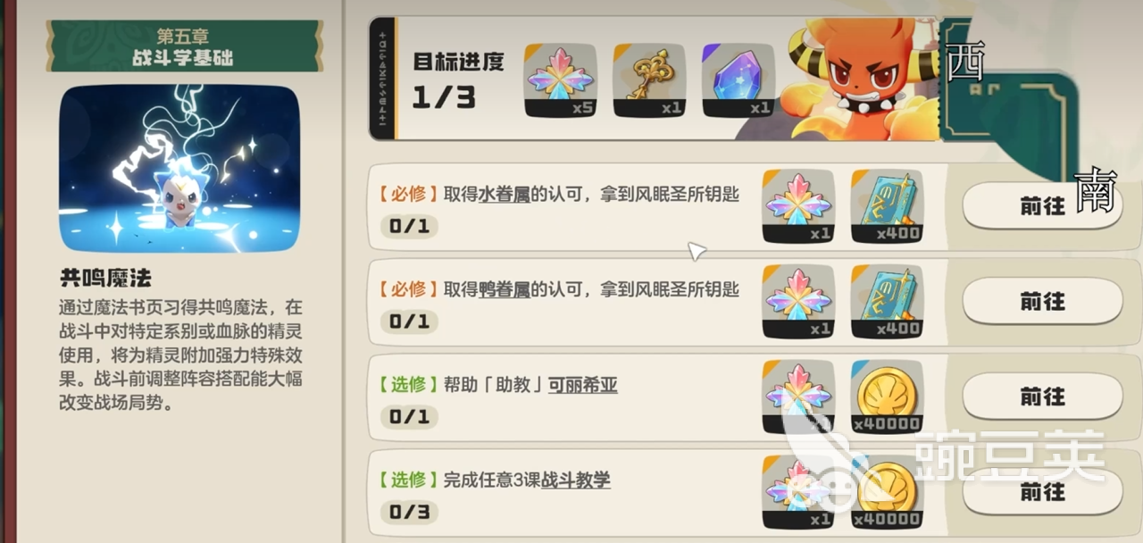 捕捉精灵这件事,很多人一开始喜欢见到什么就扔球,其实成功率很低,球也费得快。比较稳的做法是先打一打目标精灵,把它的血量压下来再投球,成功率会明显高一些。另外,捕捉的时候,最好带着点目的性,比如手上有火系宠物,就可以去找水系或者草系的精灵来配,这样遇到不同属性的关卡,手头有得换,不至于一套阵容打到底然后翻车。新手引导那条线上的任务也要记得做,里面有几个节点,比如精灵升到12级、完成一定数量的图鉴收集,做完了会给不少奖励,包括经验、金币还有一些比较难弄到的道具。