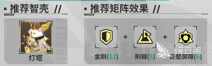 建议大家为他搭配智壳的话,可以用的是灯塔,然后矩阵效果当中推荐金刚、荆棘、巨壁屏障,这都是非常适合他用来自身防御力提升效果的搭配,这样的话根据他的防御能力,进入战斗的时候,他获取的额外反击概率也会更高,自身的增伤数值也会相比来说,根据百分比计算起来得到更多的输出加成。