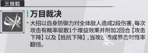 另外他在自身的终结技能,也就是必杀大招效果上面,可以带来一次裁决能力,这个叫做万目裁决的技能,会让他对敌方造成一次群体输出,攻击范围覆盖到敌人全部目标以后,会带来两段式的连击,此时每一段都带来180%,相当于他自身防御的伤害数值,而且这里每一次攻击效果当中,还有50%概率也就是一半的机会可以触发一个驱散能力,对于驱散来说,是将其中一个增益效果从对面敌人身上给驱散掉,后期附加两个回合的攻击下降,也就是说他会拿一个负面效果去换对面身上的增益效果,以及抵抗下降这类能力也是可以施加到敌人身上的,所以放在这里他换过去的负面效果可以给我方带来更多在控制上面的优势,后期他的攻击能力当中,如果成功触发暴击,在此时他带来这个驱散能力,且将负面效果换过去的概率也会直接翻倍,也就是说原来只有一半的概率可以触发,但是现在的话,他会有百分百的概率可以触发。