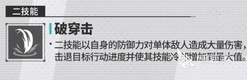 第二个技能叫做破穿击,这个能力相对来说的话是他经常用在连招里面的,使用此类攻击,他会带出一次斩击,对敌人进行输出的同时,同样也是针对单体且身上防御受到损害的敌人,对此类敌人进行攻击的时候,他造成的输出百分比上面有480%的基础伤害,这类基础伤害会比他普攻上面的伤害高很多,但是在额外附加的效果上面,没有第一个技能那么多,他此时只有一个击退目标,之后会获取百分百行动进度的升级效果,而且这个概率他成功触发,也达到了百分百的概率,那么后期就可以让他技能冷却时间也得到部分的加速,所以这个技能放在这里的话,虽然需要4个回合冷却,用起来大家得到的结果还是比较好的,毕竟这里有一个百分百的击退可以用起来。