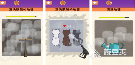 本作采用极简直觉式交互设计,适配全年龄段用户。关卡内容高度多样化:从深度清洁地毯、细致清理厨房油污,到模拟挤黑头等微场景任务,每关均设定明确目标。例如初始画面呈现一块污渍遍布的旧地毯,玩家仅需在屏幕上反复滑动虚拟刷子,即可实时看到污垢褪去、纹理复原的过程,带来即时、可控的秩序满足感。