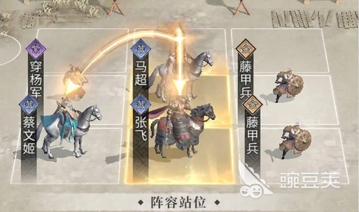 其中天赋技能效果当中大家要注意,因为马超自身的天赋能力跟追击格子上面的增加效果,是在暴击概率上面,所以目前对敌人进行输出,他会找到防御数值最低的一个敌人进行高额的爆发,所以他基本带来的爆发输出能力,是这个阵容当中最需要的输出效果,而张飞主要是保证他在辅助输出的同时,给敌人带来一些虚弱的控制,这类虚弱控制会让敌人受到马超更多的伤害数值,而其中因为都基本是属于前期用到的武将,能力没有那么高,所以放了一个蔡文姬,通过自己的余音带来更多追击的次数,包括这里治疗效果也是可以让阵容更加全面的,而马超踩到张飞跟蔡文姬的追击格子以后,还可以形成一个循环输出的阵容效果,盾兵顶在前排,我方的防御也会更强大一些。