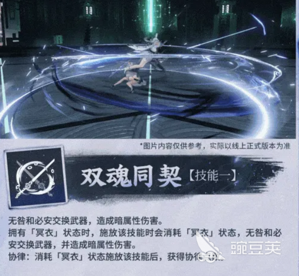 技能一"双魂同契",让无咎和必安交换武器,造成暗属性伤害。如果这时候身上有"冥衣"状态,施放技能一就会把"冥衣"消耗掉,交换武器的同时还会有额外的攻击动作打出伤害。消耗"冥衣"状态施放之后,还能获得协律点数。