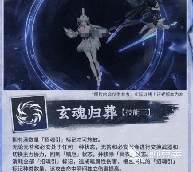 技能三"玄魂归葬",要攒满"招魂引"标记才能放。放出来之后,无论当前是什么状态,都会回到"镇厄"状态,"冥衣"也会被清掉。然后消耗全部标记造成一次暗属性伤害,而且根据消耗的标记种类数量,伤害还会额外提高。所以尽量攒齐四种标记再放,伤害最高。
