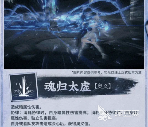 奥义"魂归太虚",造成暗属性伤害。消耗协律可以提升暗属性伤害,消耗更多协律的话,独立伤害也会跟着提高。自己或者队友打出会心的时候,会获得奥义值,所以队伍里会心率高的话,奥义的积累速度也会快一些。