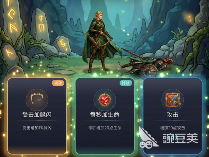 3选1强化是单通的关键,每一局击杀奖励的强化选项不要乱选,应该优先堆生存,还有攻击。界面里面的增加20点攻击是必选的,其次就要选择每秒增加20点的生命去保证续航。受击加上躲闪,应该看情况去拿,一开始小怪的伤害比较低,优先把输出拉满。在属性养成的面板里面,核心的三项就是攻击,爆率,还有吸血。金币优先选择这三个属性,攻击的速度大概是在1.0秒左右,没有必要选择去刻意的堆。技能搭配分前后期,一开始就选择跟踪毒箭加上蓄力强袭。