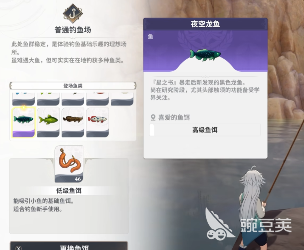同样栖息在森林区的还有夜空龙鱼。虽然它和角龙鱼一样可以在森林关卡的普通钓鱼场得到,但是它们的生态习性却大相径庭。夜空龙鱼把天上的星辰融入到鳞片里,在夜晚垂钓的时候更容易找到它的踪迹。森林关卡属于游戏早期或者中期的区域,玩家对它的地形比较熟悉,这就为夜空龙鱼的捕捉创造了条件。玩家在森林主线任务空闲的时候,在密林树冠之下可以找到类似夜空般的深邃鱼影,在安静的森林里独自垂钓。