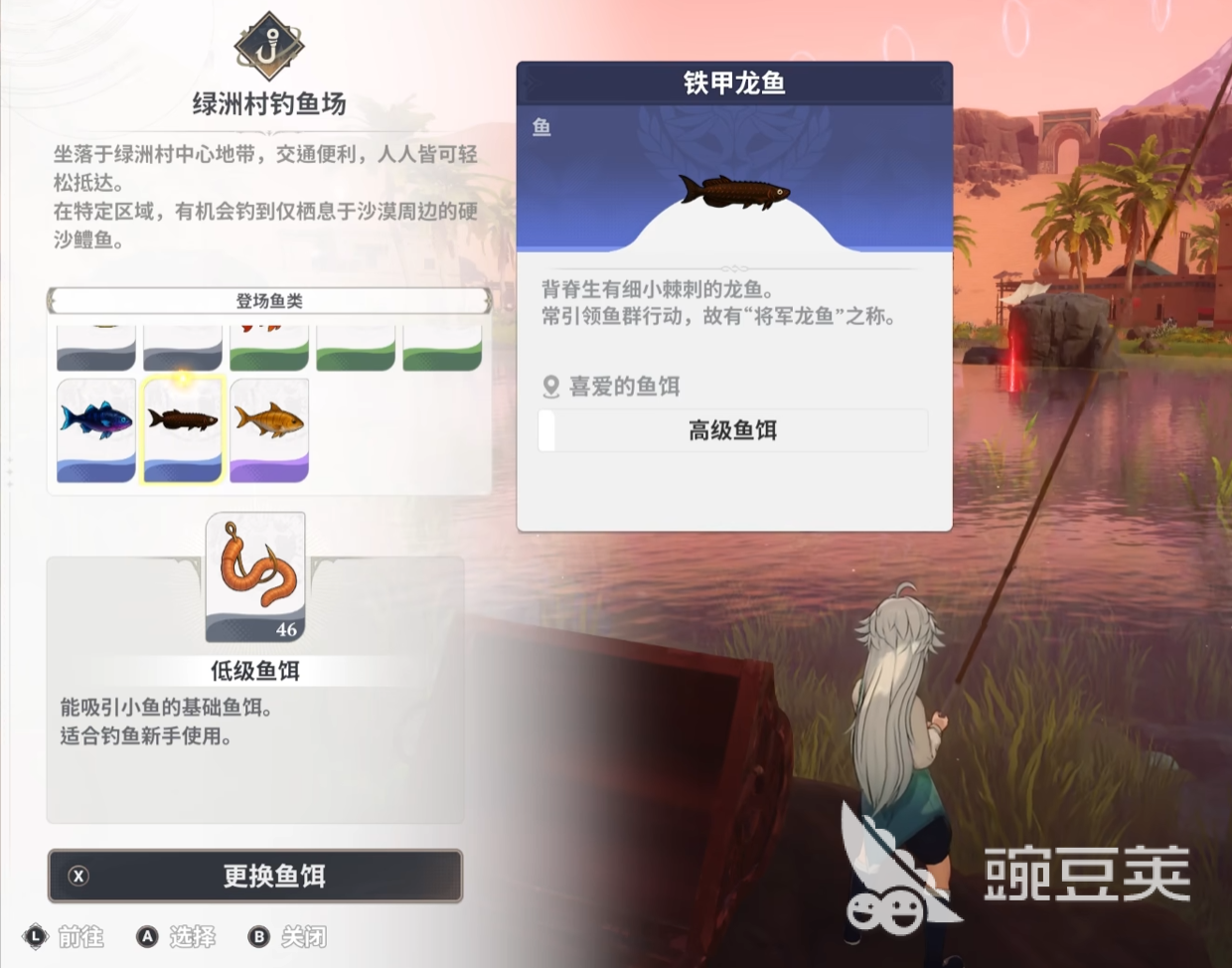 离开湿润的森林和海岸之后,大家就会把目光投向干旱的沙漠地区,那里生活着铁甲龙鱼。正如它的名字所暗示的那样,它有像铠甲一样的坚硬鳞片,可以适应绿洲村特有的水域环境。玩家要去绿洲村的绿洲村钓鱼场垂钓。