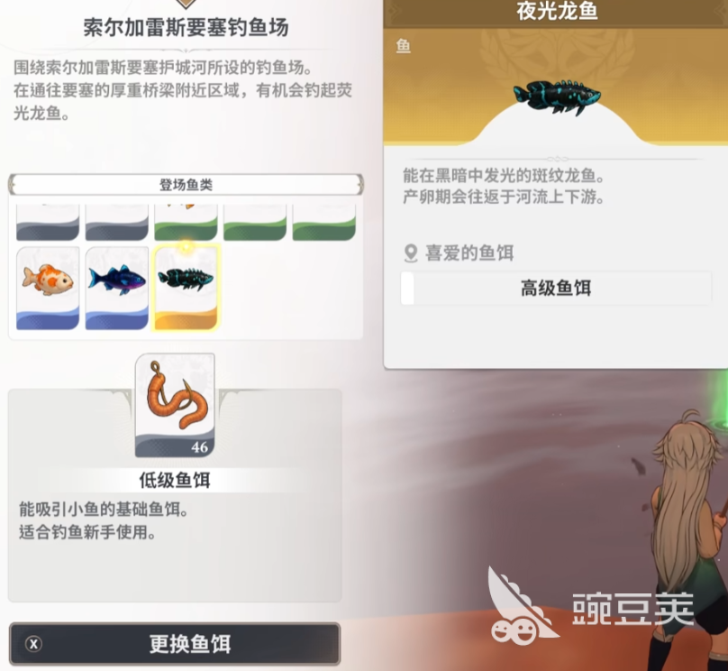 夜光龙鱼全身有幽幽的冷光在光线昏暗的时候才活动。索尔加雷斯要塞是军事重地或者古代遗迹,周围存在着强大的敌人,给钓鱼活动带来了新的危险。