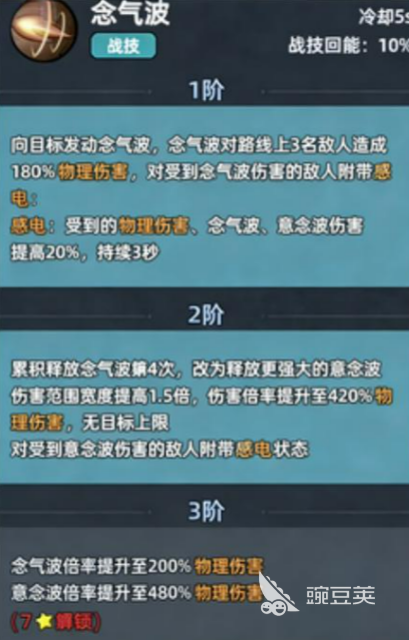 技能方面,战技"念气波"是每场战斗,必须最先用的一个技能。它的效果是直线打3个敌人,造成180%的物理伤害。但更主要的不是这个伤害本身,而是命中之后,会给目标附上"感电"状态。处于感电状态的敌人,后续再被"念气波"或者"蓄念波"打到,受到的伤害会额外提升20%,持续3秒。所以每次开场第一件事,就是先把感电挂上去,后面的伤害才能打得更高。