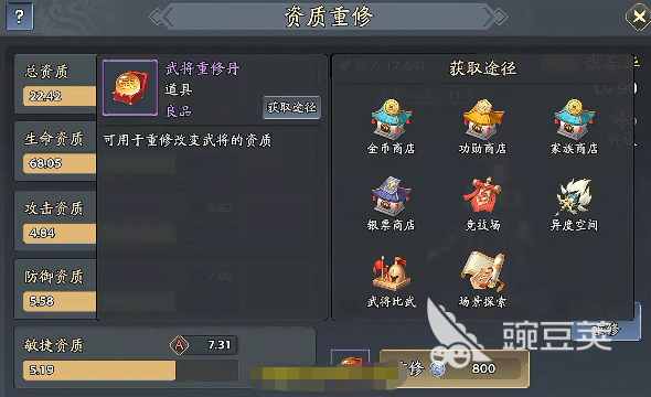 另外如果大家觉得前期自己选择的资质没有配合到他后期的培养路线,这里还有一个资质重修的系统,通过武将重修也可以提升橘色基础的资质能力,越高的资质后期在基础属性上面可以用的地方越多,而且显示的数值,大家看起来并不是武将真实的资质,需要查看外部绿色的显示数值,才是他重修以后的数值,除此之外,修过程当中,如果大家运气好的话,可以触发一个灵光一闪,灵光一闪触发成功的话,这个武将的当前资质就会变成属性上面最高的一类数值,普通武将一般在进行重修的过程当中,最多是可以触发12次灵光一闪,如果是极品武将的话,最高是可以达到28次极光一闪的,所以在后期总资质数值上面达到95%以上的时候,这类武将就是游戏当中的极品武将了,获得的属性加成也是目前所有武将当中最高的,建议大家把这些拿到极品标签的武将放在自己的主要核心阵容当中使用,这样的话就可以挖掘到武将最高的潜力了。
