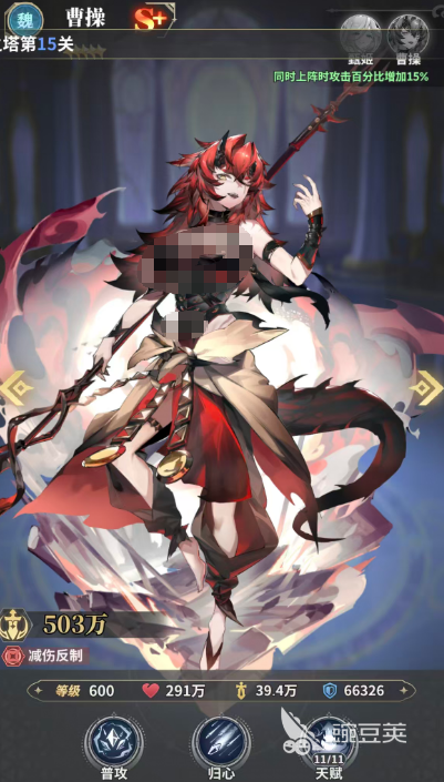 另外曹操的话,她在这里带来的同样是有全体类型的群伤80%的伤害之后,还可以让我方的减伤比例提高30%,有了这堆减伤效果,跟司马懿搭配在一起的话,我方的肉盾强度就出来了,还是她另外曹操在上阵之后,如果身后的角色不能承担单体伤害的话,会由曹操代替她来承担一次伤害,所以曹操自身在减伤比例上面,可以在九星的时候提升自己减伤比例上面的3%,这个星级增益效果还可以层层叠加,一直叠加到60%,这样叠加起来的话,我方可以用到的增益就更多了。