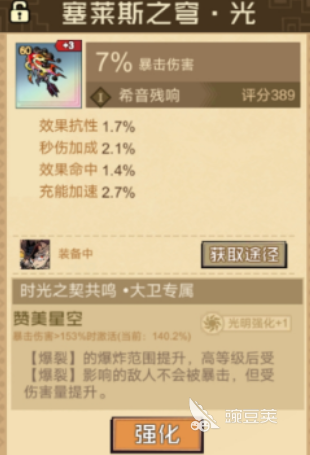 第三个大家可以看看大卫这个角色的残响,大卫当前也是经常会在强度榜当中被大家分享的角色,而大卫当前的能力当中也是更适合玩火队的,他适配的装备就是塞莱斯之穹光,在这里带来的残响类型也是希音残响,但是效果跟上面的沙拉曼是一点也不一样的,这里他可以通过其中的词条效果带来基础7%左右的暴击加成,而且在针对敌人的攻击上面他还可以增强自己的抗性,所以在后期想要用大卫带来更多秒杀效果的话,大家就可以查看他的爆发能力,而这里触发了残响共鸣之后,他还会有一个赞美星空的专属能力,在其中可以让自身的爆炸输出范围提升,但是等级提升后被他技能当中爆裂状态影响的敌人是不会感受这样的暴击,而是受到大卫伤害的时候会有一部分加强的伤害效果,所以不管是哪一方面的能力都是要提高大卫的输出数值。