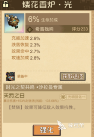 第二个是大家常常会用到的沙拉曼,当前的沙拉曼是火队组成当中必用的成员,而为她进行搭配的话这里一般用到的就是镂花香炉,这个装备上面用到的残响是希音残响,这类残响目前可以给她带来的词条加成效果当中,除了基础的6%生命加成之外,还有一部分的充能加速效果,另外在受到对面伤害的时候,会自动触发一部分的控制,而且这里她通过此类能力可以触发的时光之契共鸣效果当中就是天罚之日,这个能力相信玩火队的大家都是知道的,也就是可激活了天罚之日之后,角色在暴击伤害上面可以带来很大的提升,而且在火系输出的时候会有更多的能量可以发出流畅的联合输出。