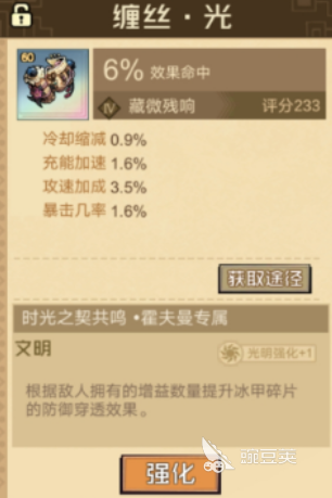 第一个介绍的是霍夫曼的残响专属效果,在其中大家只要为他装备缠丝光,就可以触发这里的藏薇残响,效果就是会拥有6%数值的命中加成效果,而且在其中还可以为角色技能的冷却时间带来一部分的缩减,另外在攻击速度上面同样是有加成的,对于大家想要充能的情况下,就可以用到这个残响当中带来的此类词条效果,通过能力看的话霍夫曼在搭配了这样的残响之后是更适合走前排控制定位的,而这里装备跟残响一起可以触发的就是专属文明当中也会有一类共鸣效果就是时光之契,有这些残响装备以及共鸣的话。霍夫曼在施加控制给敌人的时候,也有不错的输出哦。