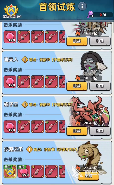 进入到首领试炼之后,会有大量角色等待玩家对战,每个角色的战力,包括击杀奖励和弱点,都会直接展现出来,玩家需要根据自身的能力选择对手,沙漠之王在游戏里的战力非常高,作为水属性元素的角色,玩家在挑战之前需要先了解角色自身的机制和特性,再去选择对应的成员加入挑战,沙漠之王在对战的过程中会形成分身,每增加一个分身,角色的攻击力就会提升,在挑战过程中还会释放扇形的水浪技能,每次被击中之后,除了基础伤害之外,还会带来大量的附加伤害,等对方血量下降到30%以下之后,攻击频率会提升,同时分身的刷新时间也会缩短。