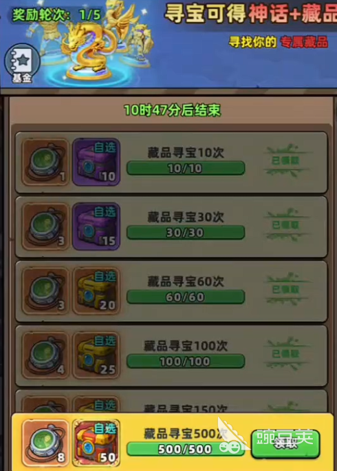 每次寻宝都有机会抽出大量藏品,另外游戏关于寻宝会设定保底,每抽取20次,有机会得到神话或者传说级别的藏品,常规抽取过程中,有机会获取普通的黄色品质藏品,建议玩家多在游戏里抽取,争取让自己得到更多高等级的藏品,连续抽取100次之后能直接获得藏品冲刺碎片自选宝箱,宝箱里面可以开出大量高等级藏品,玩家可以选择其中一个直接获取。