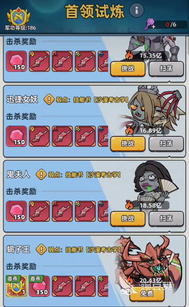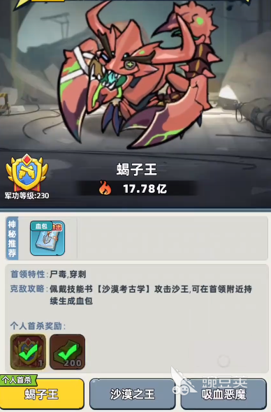 蝎子王是游戏里战力相对来说比较高的一个对手,整体战力达到了20.43亿,比鬼夫人的战力更强,假如玩家可以顺利对抗鬼夫,只要稍稍增加一些战力,就可以尝试挑战蝎子王,战力足够的情况下,玩家可以顺利应对蝎子王,在对战之前要先了解对方弱点,蝎子王和鬼夫人的弱点一样,都是沙漠考古学技能书,掌握对方战力和特性之后就能正式开战,要想战胜对方,玩家必须要先保证自身的战斗能力,建议先去选择几个强力的坦克,避免在挑战过程中受到更多伤害。