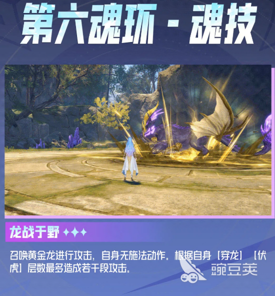 第六魂环魂技龙战于野,是一个很有特点的技能。释放时,王秋儿本人没有明显的施法停顿,而是直接召唤黄金龙发动攻击。这意味着,她在打连招时,不容易断节奏。这个技能的段数,还会按照【穿龙】和【伏虎】的层数来变化,层数越高,打出的攻击次数就越多。所以前面攒层数不是为了好看,而是会实实在在影响这个技能的上限。把两种层数尽量堆起来,再放龙战于野,伤害会更满。
