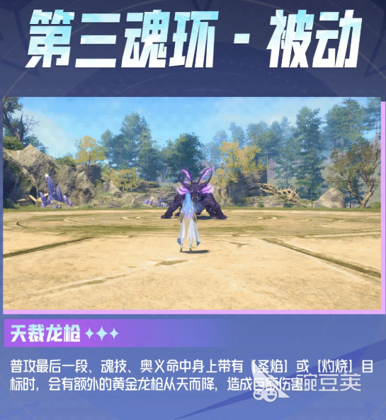 第三魂环的被动是天裁龙枪。这个被动对王秋儿很重要。只要普攻最后一段、魂技或者奥义命中带有【圣焰】或者【灼烧】的目标,就会追加一把从天落下的黄金龙枪,再补一段高伤。这个效果,让她和带火属性状态的队友配合时,会更舒服,自己打连段时也会更有爆发。看起来是被动,实际对总伤害的帮助很大。