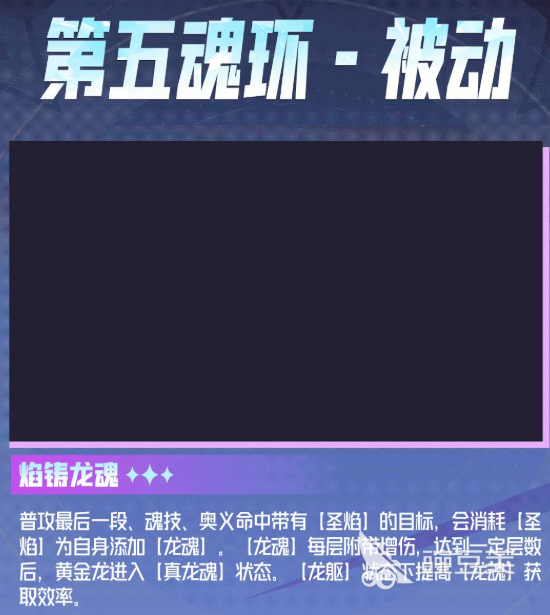 第五魂环被动焰铸龙魂,是她后期伤害继续往上走的重点。普攻最后一段、魂技和奥义打中带【圣焰】的目标时,会消耗掉这个状态,然后给自己加上【龙魂】。每一层【龙魂】都能提升伤害,叠到一定数量后,还能进入【真龙魂】状态。到了这一步,输出会有一次明显提升。而且在【龙躯】状态下,获取【龙魂】的效率还会更高,所以这两个效果是能连起来看的。先开强化,再去叠层,节奏会更舒服。