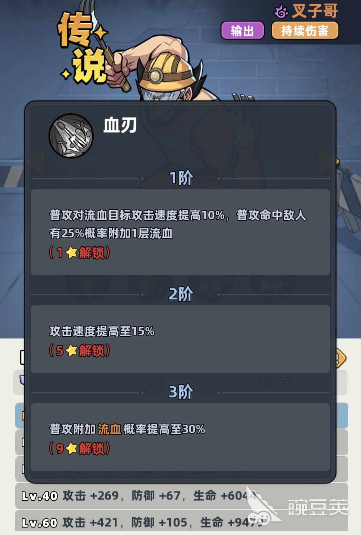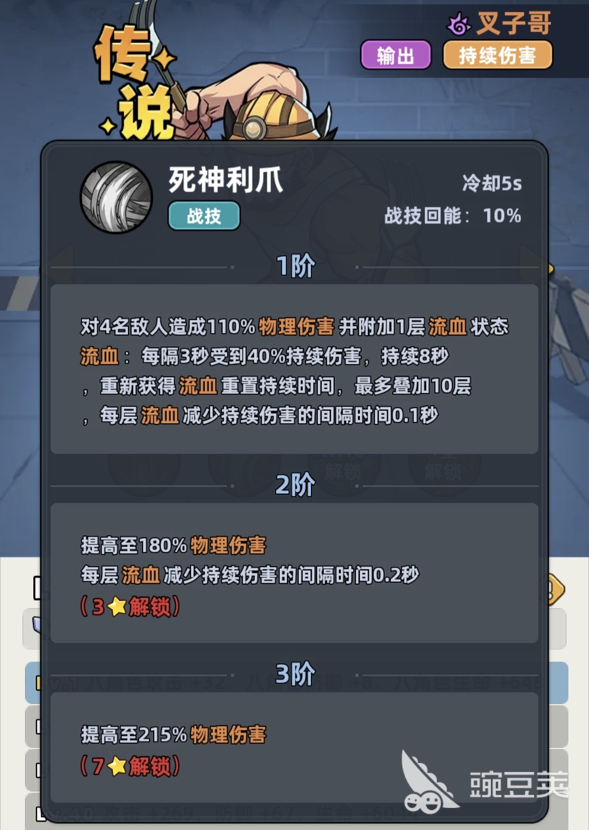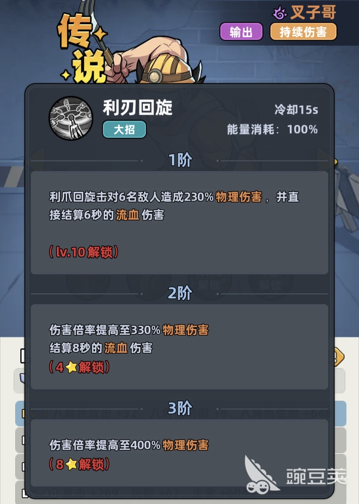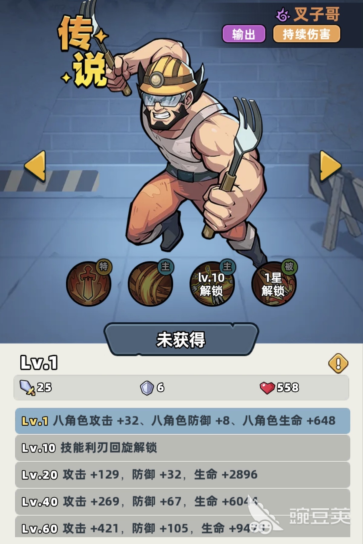 叉子哥拥有传说品质基础属性,在全角色梯队中处于中上水平,但受限于品质上限,无法跻身T0层级。其职业特性为“所有伤害提升25%”,幸存者特性为“持续伤害提升10%”。两项特性叠加后,显著强化了流血类DOT的实际收益,使其技能链天然倾向构建多层流血状态,而非依赖单次爆发。