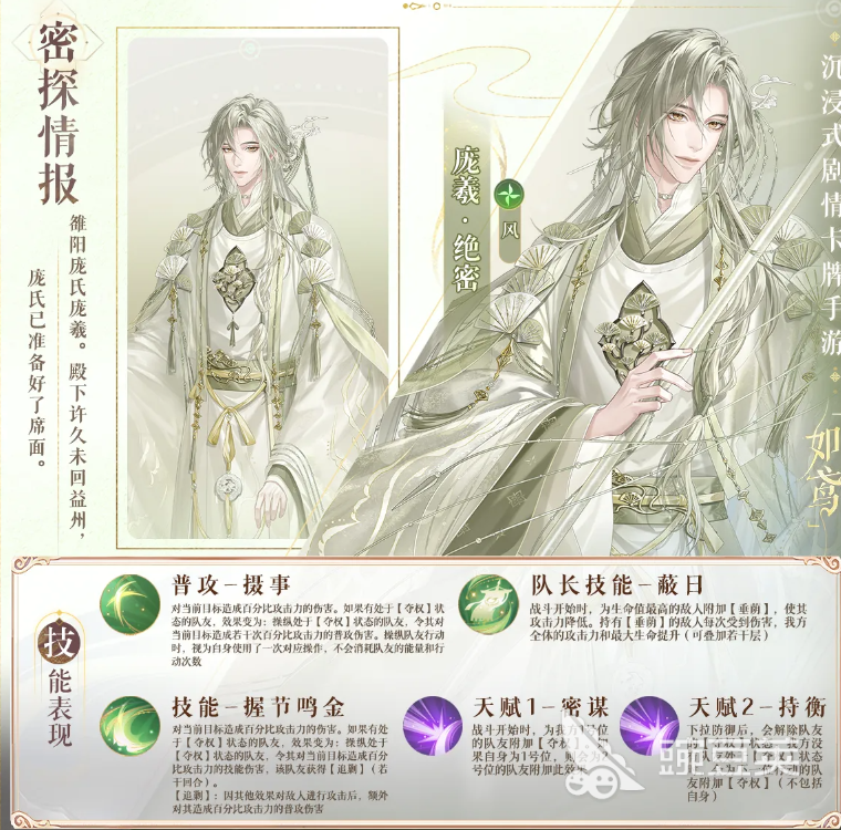 关于庞羲角色定位,其为功能性辅助密探,核心机制围绕“夺权”展开——该效果可令处于夺权状态的友方单位额外触发一次普攻或主动技能,有效优化输出节奏、填补技能真空期。该角色起步门槛低,一星即可投入实战,适合中前期队伍构建与过渡阶段使用。