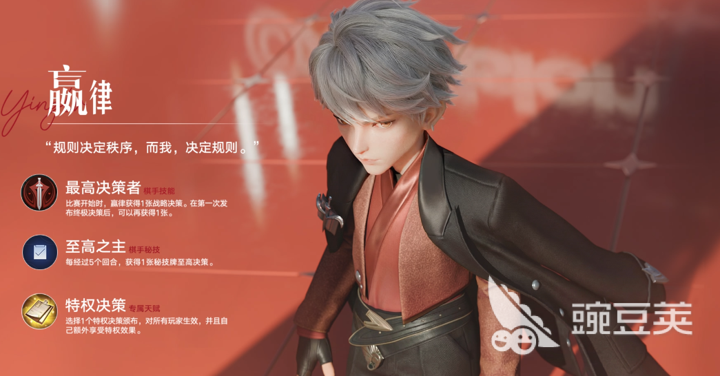 终测版本中唯一新增角色为嬴律——一位以战略统筹见长的高阶棋手型英雄。其核心定位聚焦于全局节奏控制与多阶段战术引导,技能体系包含【最高决策者】、【至高之主】、【特权决策】三大主动机制,在实战中形成显著的局势主导优势。