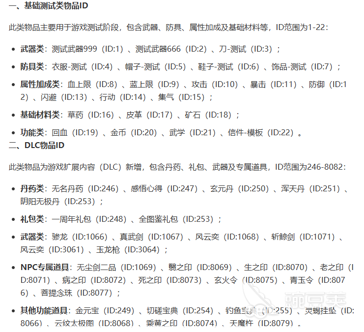 本文重点解析《逸剑风云决》手机版道具ID体系——该编号系统是识别全部可交互物品(含丹药、武器、食谱、材料等)的底层标识符,广泛应用于MOD开发、存档编辑及资源调试等技术场景。玩家可通过解析游戏本地数据包定位对应ID字段,实现道具数量调整、稀有度修改等个性化配置操作。具体ID对照示例详见下方图示: