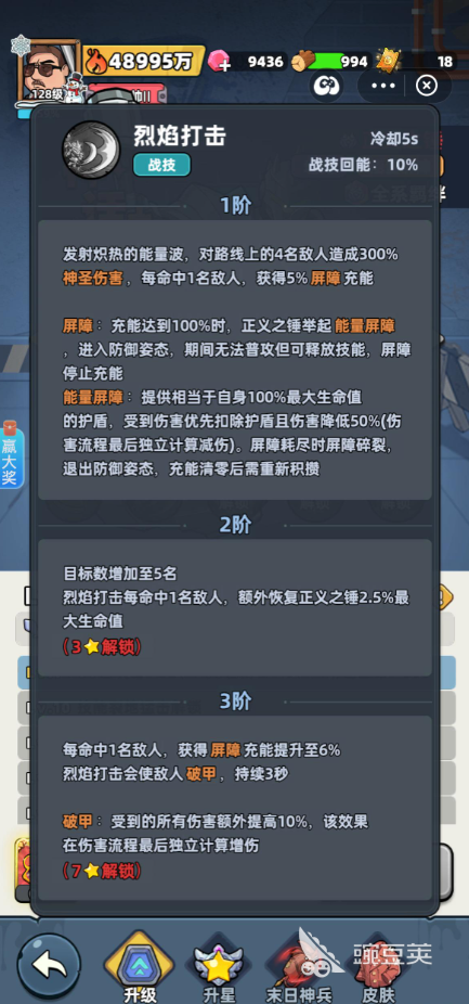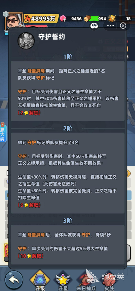 技能守护誓约,当正义之锤举起屏障时,身边的三位队友将会获得守护标记,其受到的伤害将会转移50%给正义之锤。技能烈焰打击施展之后,将会对前方发射能量波,位于技能伤害范围内的4名敌人将会受到300%的伤害,每命中一名敌人可获得5%的屏障充能。该技能升至二阶时,可命中5名敌人每次能够使自身的生命值恢复2.5%。升至三阶时,屏障的充能数值将会提升至6%同时被打到的敌人都会获得破甲状态,持续三秒,在此期间所受到的所有伤害都会提升10%。