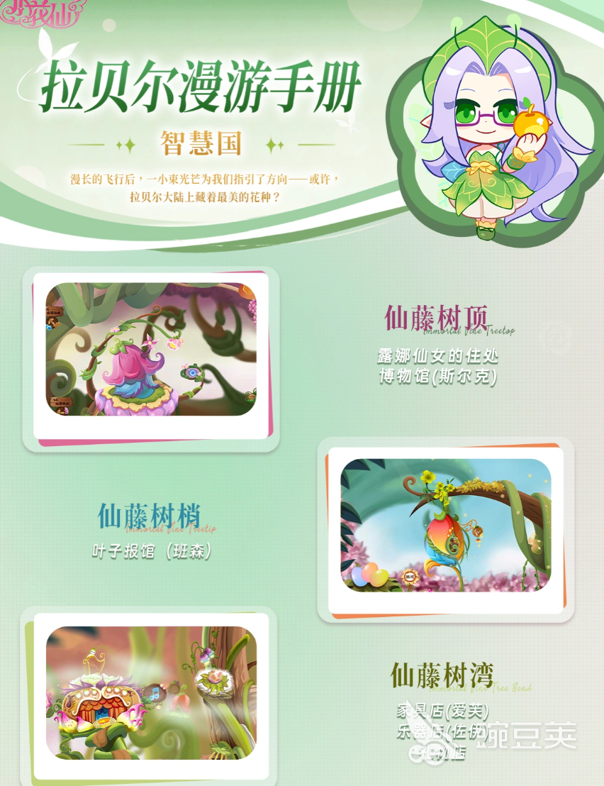 智慧国的居住地点以仙藤树为中心,分为仙藤树顶、仙藤树梢、仙藤树湾。仙藤树顶是露娜仙女的住处,也是博物馆(斯尔克)的所在地,仙藤树梢上坐落着叶子报馆(班森),仙藤树湾汇集了家具店(爱芙)、乐器店(佐伊)、礼物店。这些地点既是智慧国居民生活的地方,又是玩家进行智慧国的探索以及完成各种任务的地方。