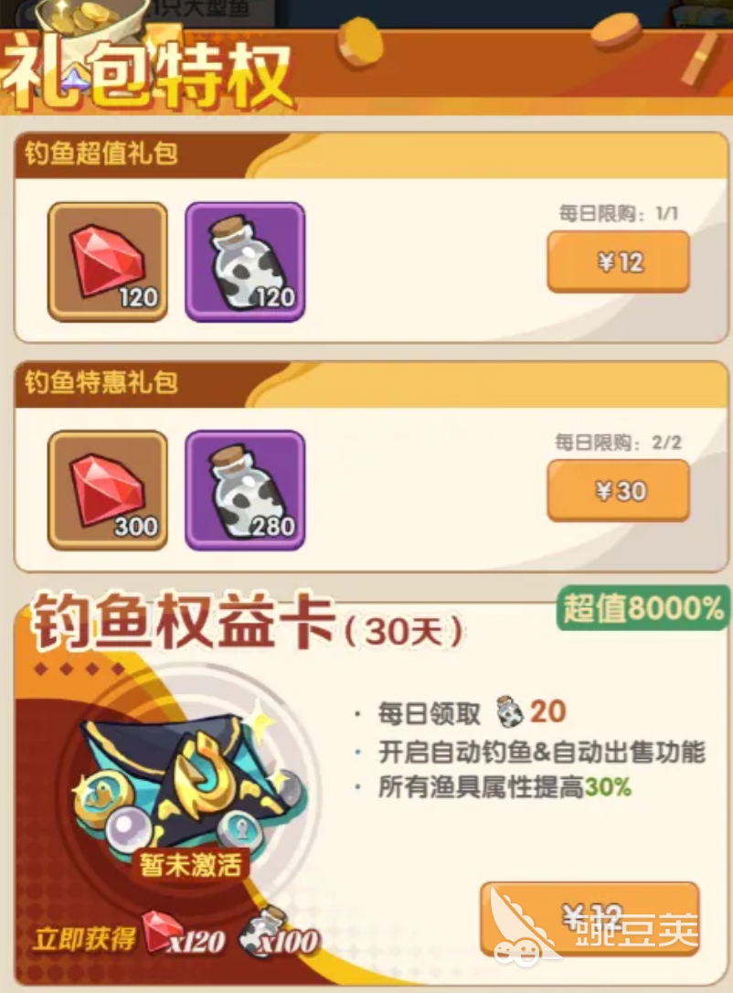知道有些玩家喜欢一个人在鱼塘,心在度假的新版钓鱼权益卡已经上线。激活一张权益卡,就可以获得三个躺赢特权,直接到账钻石和牛奶瓶体力,让你开局就领先一步,开启自动钓鱼、自动出售功能,解放双手,睡觉也能爆护,全渔具属性提升,稀有鱼上钩率悄悄拉满。这些特权使钓鱼变得事半功倍,很快就会成为钓鱼界的传奇人物。