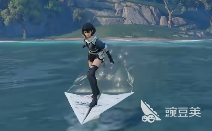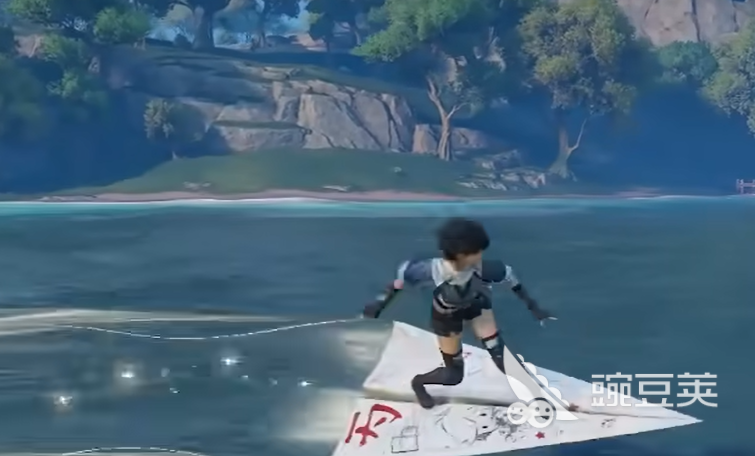 大家在商城里面,会看到这个载具纸飞机。站在纸飞机上面,角色是站立姿势的,这一点和大多数载具差不多。二段跳没有特效,这个可能会让一些玩家觉得少了点什么。不过纸飞机有一个很抢眼的地方,就是拖尾特效特别长,飞过去之后,留下的痕迹拉得很远,视觉上还是挺好看的。